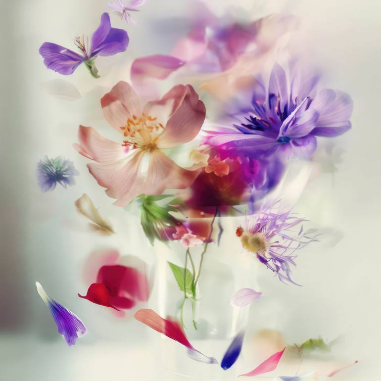 Agnieszka Maria Zieba is a Polish artist whose work explores a conceptual approach to photography, with a strong focus on nature and floral subjects. Her practice combines photographic collage, 3D composition, and digital painting to create richly layered, surreal visual worlds. Zieba invites viewers into imaginative spaces where reality is gently subverted: pink clouds float above giraffes, dogs wear floral garments, and botanical elements blend seamlessly with abstract forms. In her work, flowers are not mere decorative motifs they become central figures of emotion, symbolism, and transformation. Her compositions challenge visual expectations while offering glimpses into a more harmonious, almost utopian reality. With elegant, minimal construction, she captures fleeting moments of beauty aiming not only to celebrate them, but to preserve them for the future. Through expressive digital brushstrokes and a bold use of color and form, Zieba merges the photographic with the painterly, the natural with the constructed. Her work is both playful and profound an invitation to see the world with renewed curiosity, openness, and imagination. Her photographs and digital works are currently exhibited in galleries across France, Germany, Switzerland, and Poland.