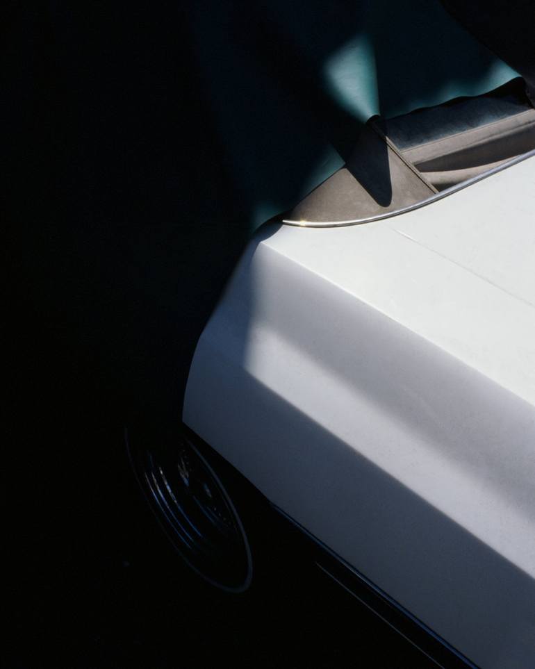 Street photography captured in Los Angeles of a vintage car with its colorful cover slipping off as the harsh shadows accentuate its shape but hide its identity. - Film Photograph, Pigment Inkjet Print - Epson Somerset Velvet 255 GSM Fine Art Paper - Limited Edition 1 of 25 Signed