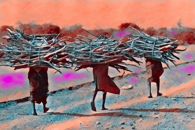 In 1992 near Baidoa Somalia a daily ritual takes place when women gather wood for cooking and heating near a field outside of the village. American troops had been sent here to help get food supplies from non profits and donations to many of the starving population. Gangs were taking the food suppl...