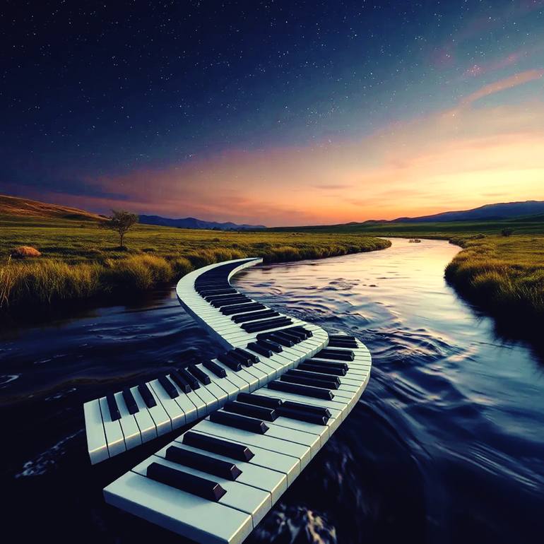 A surreal scene where piano keys flow seamlessly into a winding river under a starlit sky. The serene landscape adds to the mystical atmosphere. Art photograph by Dietmar Scherf (2025). Original (only 1 Original in existence in the world), signed, numbered (as 1/1), titled and dated by Artist Dietma...