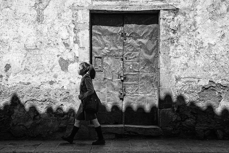 Schoolgirl walking quickly through unsafe area of town, with shadows suggesting that someone, or something, is watching her. ----- Limited Edition prints: MOAB Somerset Enhanced Velvet 330 gsm cotton rag paper
