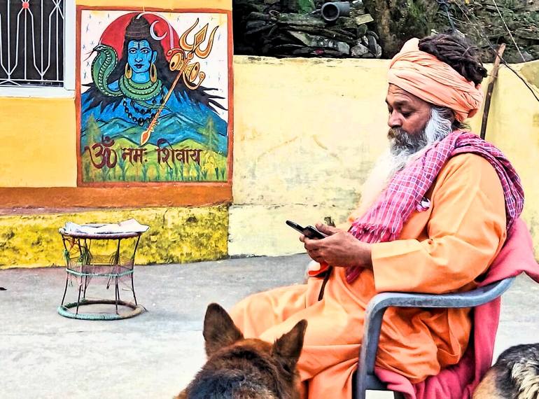 This picture was taken in the Himalayas,India. I loved the contrast between the various different elements in the frame especially the holy man on his mobile.