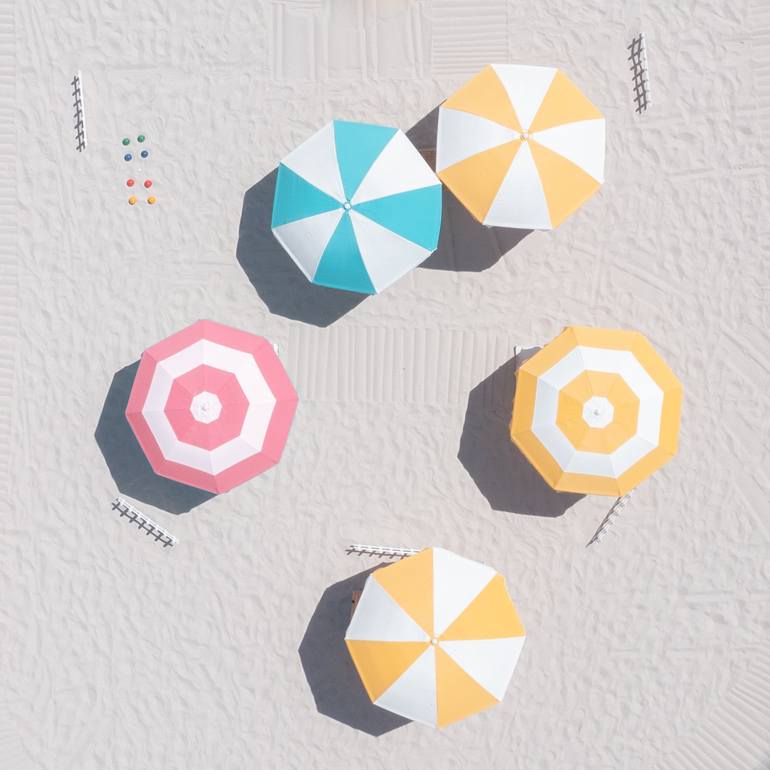 A top down view of a beach in Miami, sunshades in pastel colors and a clam and pleasant ocean.