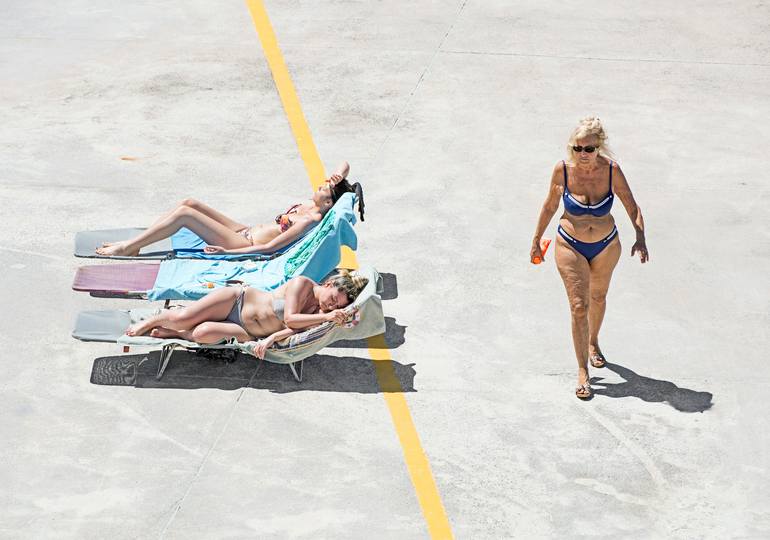 the latest from my stabilimento balneare series. shot in june 2016. view on a concrete platform. old meets young. the picture tells its story itself (torturing oneself in the sun). ultra high resolution, ultra sharp. part of my exhibition genova – concrete & color. fine-art-print hahnemühle phot...