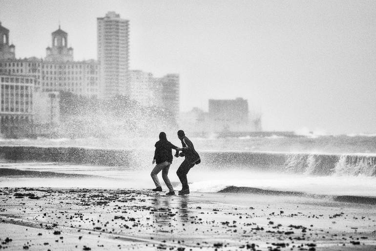 Documentary street photography from The Malecon, Havana, Cuba. A young adult couple takes a risk as a stormy weather hits the Cuban coast.