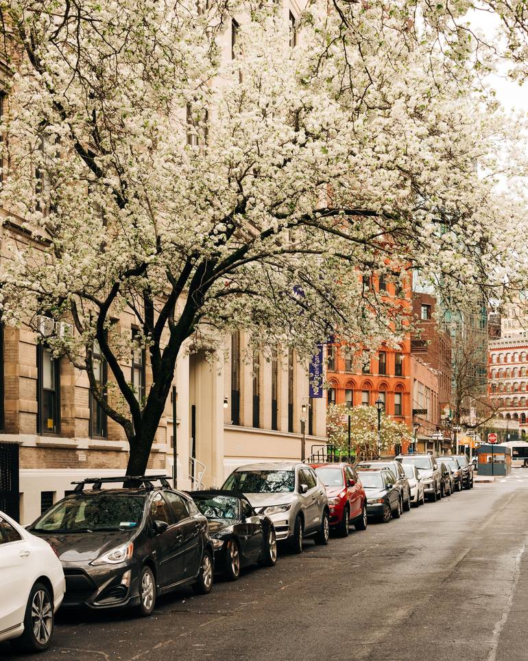 Flowering trees on Stuyvesant Street, in the East Village, Manhattan, New York City - digital photographic print by travel photographer Jon Bilous