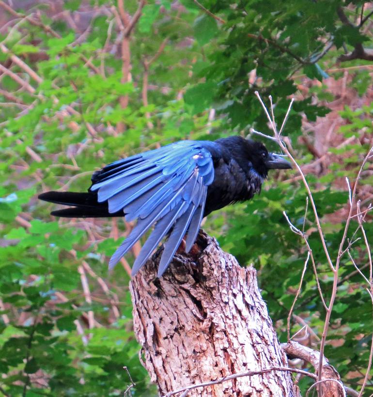 During a hike through a Canyon in Zion National park, Utah, An aesthetically interesting bird landed on a tree stump just as I snapped the image, standing out against the green of the leaves and the orange of the canyon.