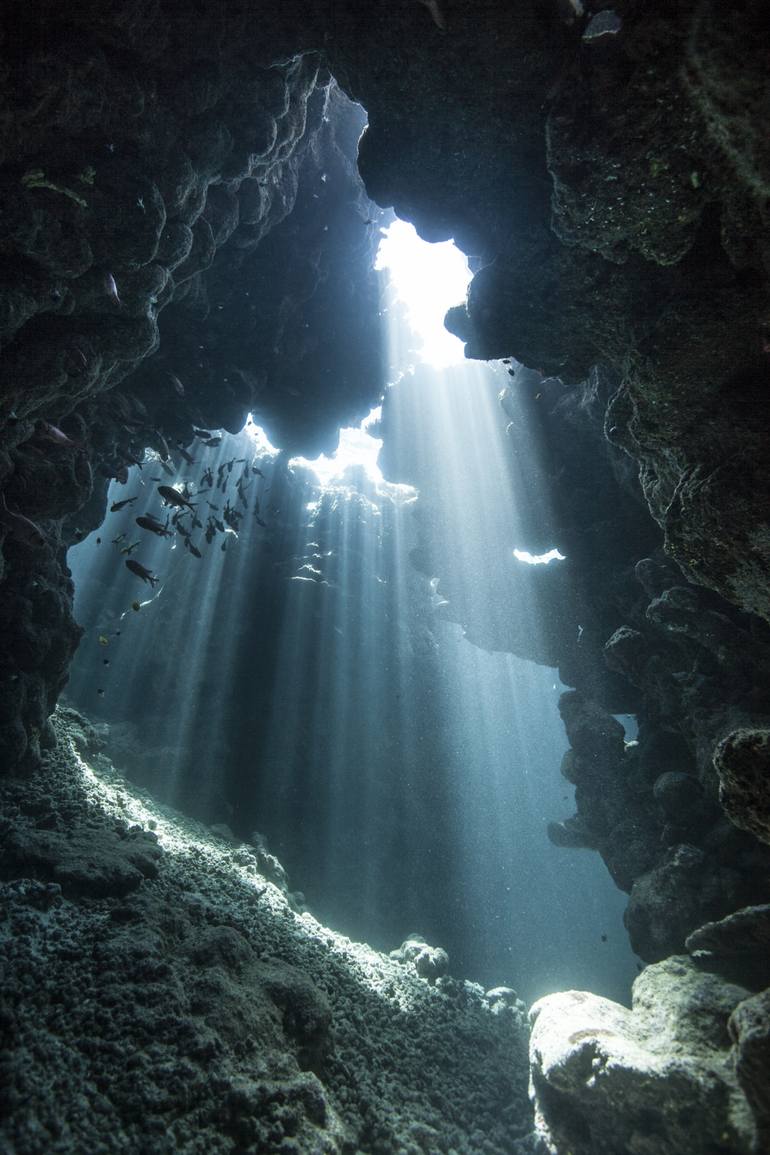 A series of overhangs and underwater caves in Egypt. At midday the sunlight dances and streaks down through the gaps, blasting down spreading over the sandy floor. Cave Light Series. This piece is currently offered in 24 x 16 inches. Printed on fine art Hahnemuhle archival quality 350 gsm, 100% c...