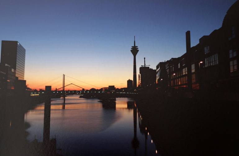 I took this photograph at 06/Aug/2020 while the sunrise in Dusseldorf, Germany. The colours of the sun at the horizon build the opposite of the blue sky. The reflection on the surface of the water is just beautiful. The photograph is printed on Hahnemuhle - FineArt Baryta ® Paper. 325 gsm, 3 mm Al...