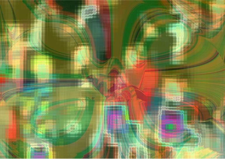 Gerasterte Farbflächen mit verschiedenen Farben vor olivgrünem Hintergrund. Vier grüngelb streifige kleeblattartig-symmetrische integrierte Schleifen.