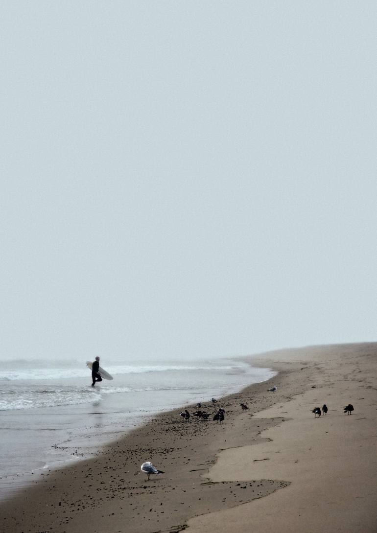 A lone surfer exits the water on a foggy Cape Cod day. He is quite small compared with the sea, sky and beach that surround him. I composed the image this way to emphasize the size and power of the ocean and the vastness of the sky, but also offer a square version. Finished with a deliberate grain.