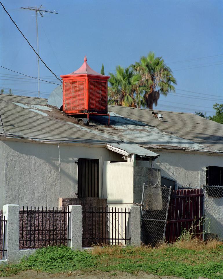 An early form of air conditioning, the swamp cooler, sits upon a San Bernardino CA roof. I made this shot because the swamp cooler is becoming historic, and I was provided with several primary colors ... red, yellow, and blue. I print my own work to preserve the utmost quality, and do so with archi...