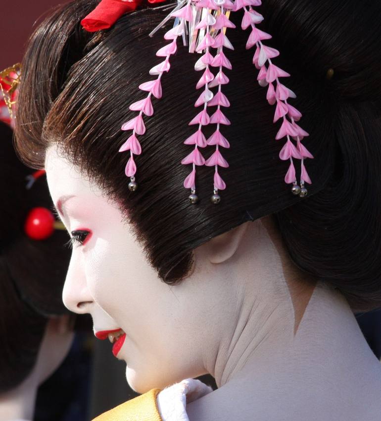 TOKYO GEISHA During a traditional Japanese wedding ceremony I noticed this Geisha bridesmaid glance over her shoulder with the slightest of smiles. The unpainted skin on her neck mirrors the shape of the delicate flowers.