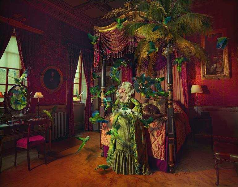The Parrot Room, Satin Small Edition 50 x 63cm (20 x 25") limited to 20 + 2AP. A woman amidst a flock of green parrots. Shot on location at Holkham Hall, England, interweaved with composited birds and palm tree as part of Miss Aniela's Surreal Fashion series. Miss Aniela's photography interweaves ...