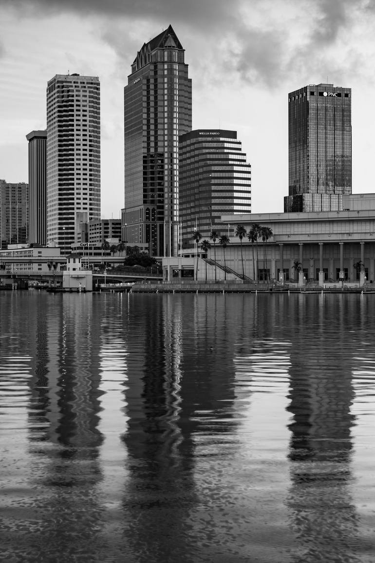 Tampa skyline reflections on the Bay monochrome wall art print. Skyscrapers of Tampa Florida at sunrise. Black and White / Monochrome Edition