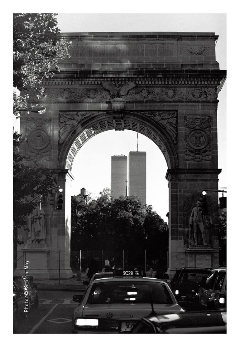 "The Arch No.1" This image shows the famous Washington Square Arch at the end of the 5th Ave with the Twin Towers in the background and was photographed by Stefan May aka “Lensfield Project“ analog on black & white negative material in New York City in 1999. • New York 1999 • Giclée Print • Ed...