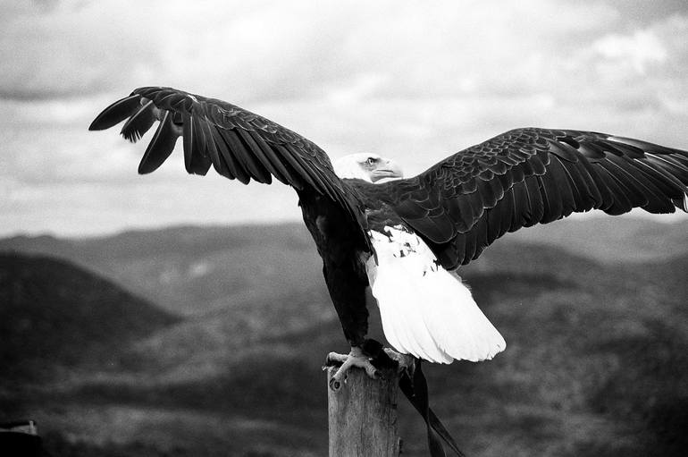 Bald Eagle As if I could see every single reflection in his eyes as this beautiful bird slowly scoured the sky around him. I captured this image on B&W film, later developed the image in the darkroom. Since, a digital file was created from the negative. This image was taken at the top of Mont T...