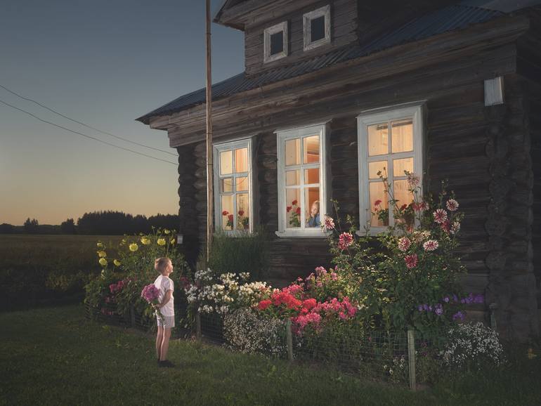 A young boy stands outside a rustic wooden house at dusk, holding a bouquet of flowers behind his back as he looks up at a girl gazing out from a flower-filled window.. This photo is to be hung somewhere you see every day. Whether that be in your bedroom and it’s what you see when you greet the day...