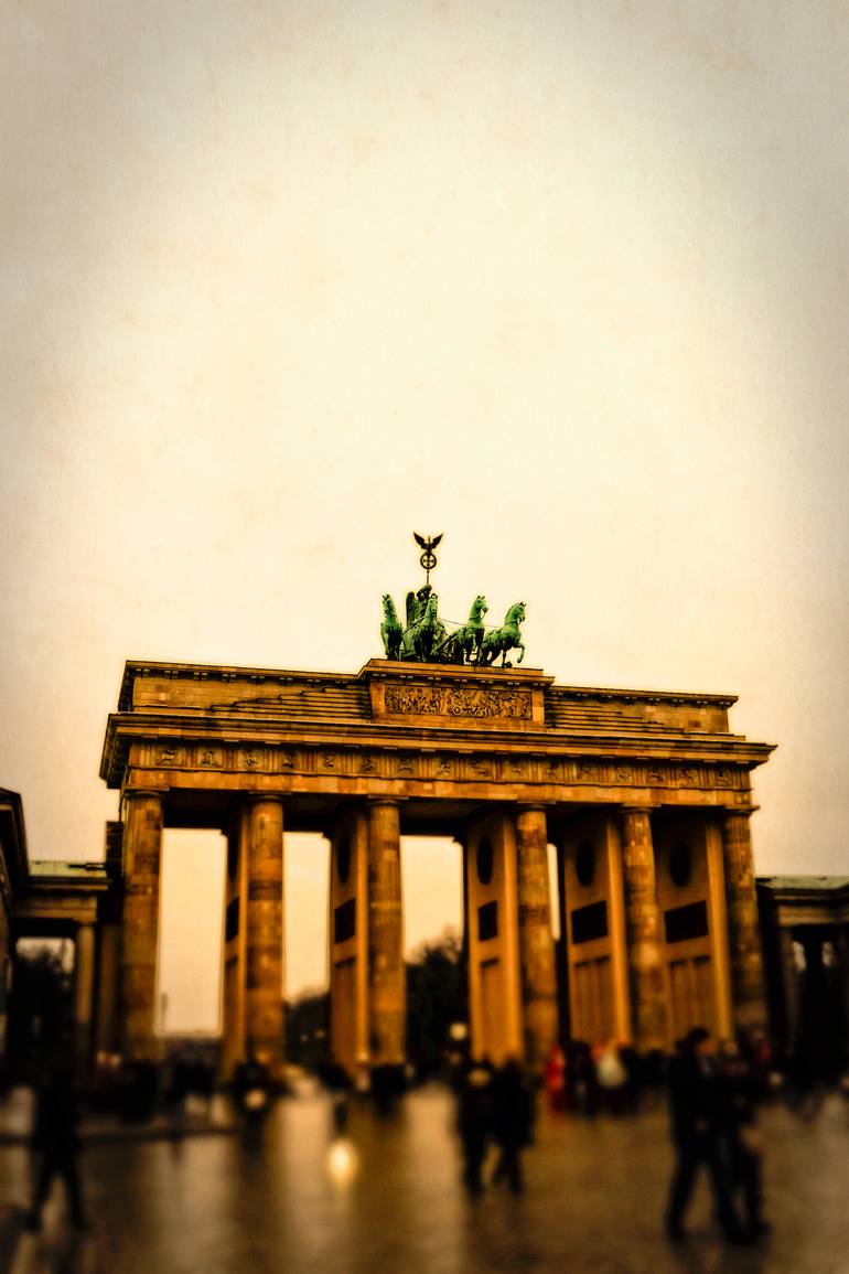 The Brandenburg Gate or Brandenburger Tor in Berlin Germany.The dramatic Quadriga Sculpture sits atop of this famous landmark. The image has an overlay and blur applied to the overall image to add to the mood. The image is a limited edition unmounted authentic work produced to the Giclée establishe...