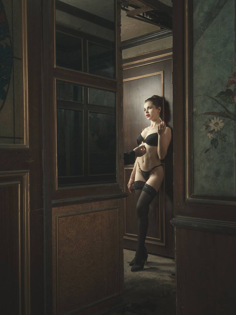 A woman stands in an antique room, leaning against a doorway, her gaze fixed on a man hidden around the corner as he reaches out to light her cigarette. The scene combines elegance and tension, framed by dark wooden panels and shadows. This photo is to be hung somewhere you see every day. Whether th...
