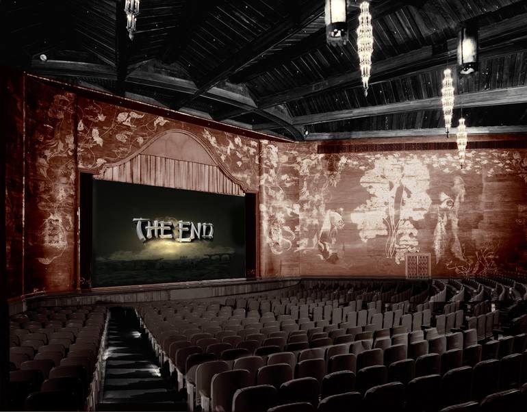 A grand theater with chinoiserie wallpaper and hanging chandeliers with the end titles on the silver screen. The work is on high gloss, high definition Alumium which is float mounted 1.5 inches from the wall. No framing required. (see additional photos). Can be ordered in custom sizes or on pape...