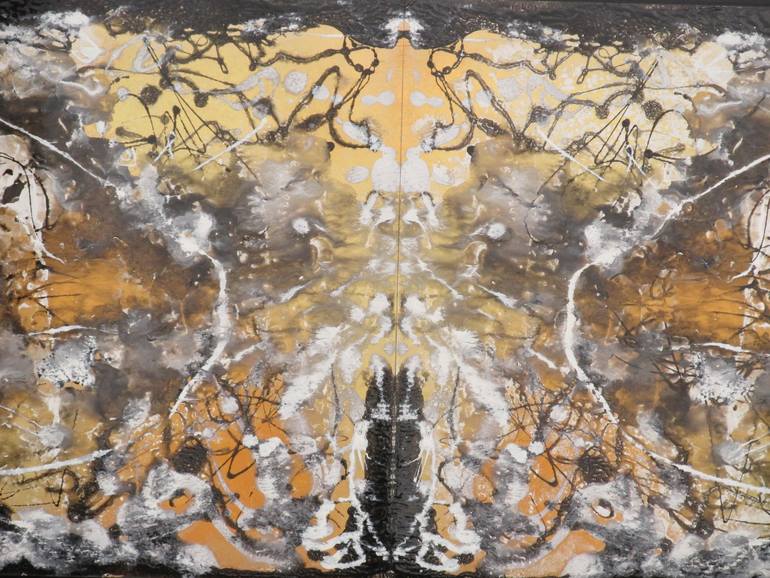 This is a photo of the middle of the painting. I keep seeing a ladies face that appears and wearing some sort of helmet or hat , and then disappears into some other shapes and faces. The original painting got moisture problems from a gallery exhibit and warped the card enough that it would not be g...