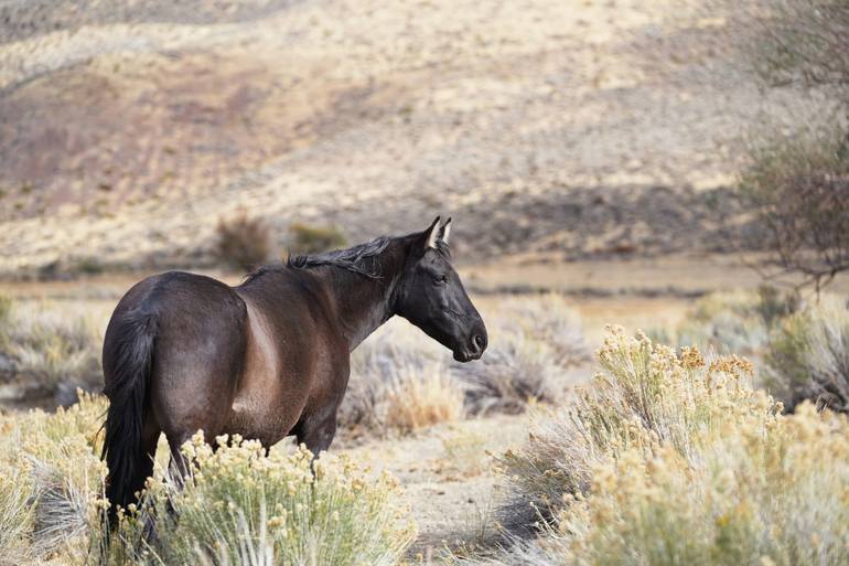 The image of the dark brown/black wild mare standing in amongst soft toned grass and brush creates a feeling of calmness and warmth. A natural environment stimulating the sense of stillness and watchfulness. This photograph is part of a series documenting the Virginia Range herd of wild and feral h...