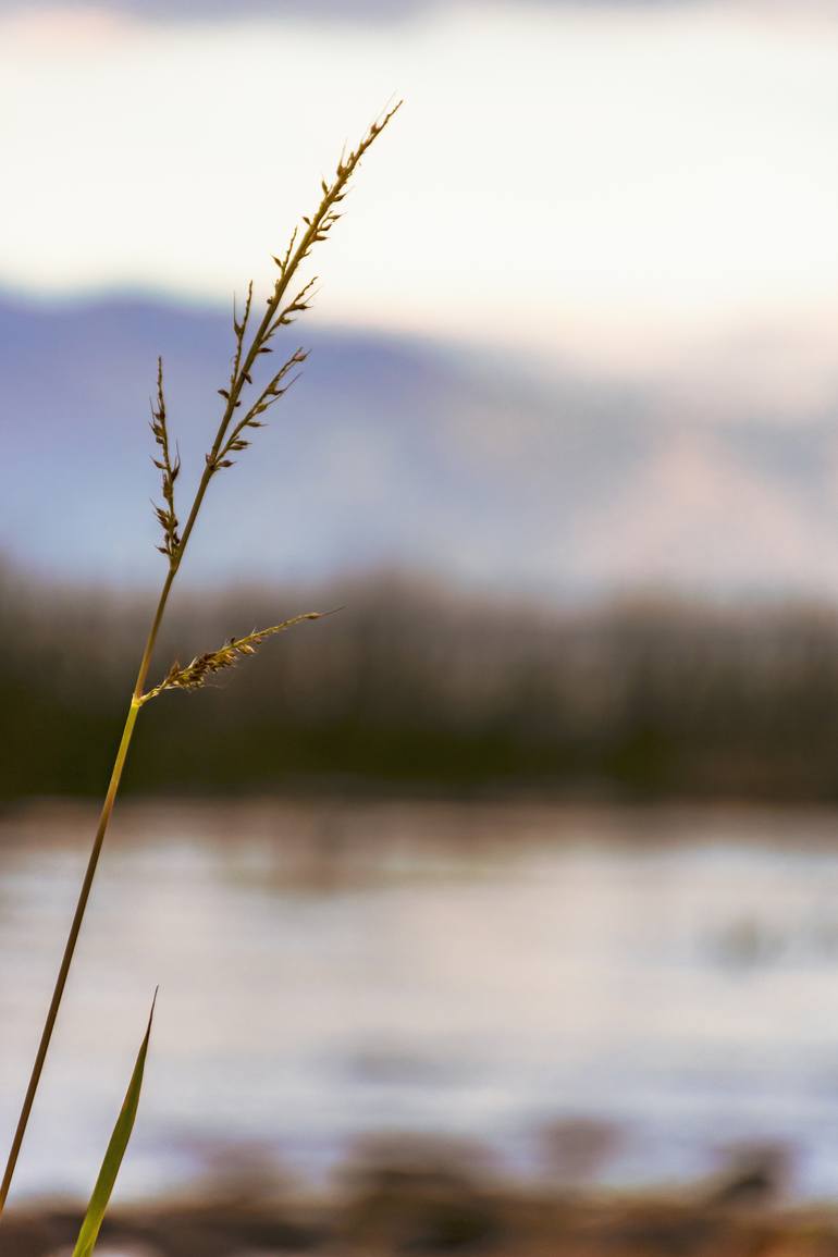 Single isolated grass backlit against the sunset light with Lake Atitlan in the highlands of Guatemala behind.