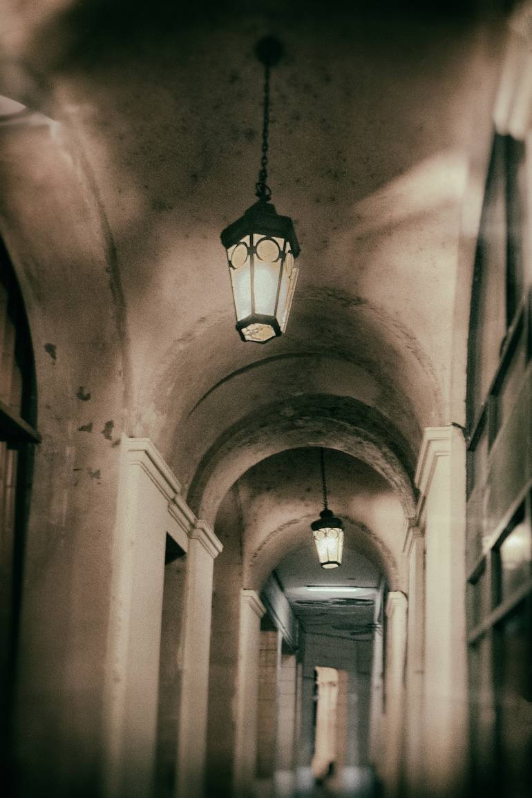 Conceptual night-time piece, A lamplit covered walkway running parallel to The Prado in central Havana, the lamps sway gently in the dead of night breeze. The defocused and grainy qualities add to the sense of atmosphere. (La Habana) Havana Cuba. Using a wet plate technique to emulate the old larg...