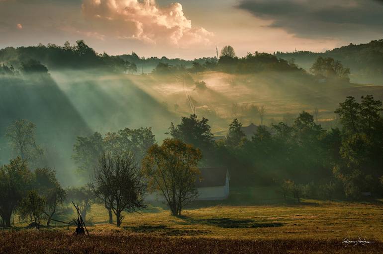 Capture the serene beauty of daybreak with "The Morning Light," a stunning landscape photograph. This piece evokes the quiet stillness of a mountain valley bathed in the soft glow of sunrise. The delicate balance of color and light creates an atmosphere of peace and tranquility. The artwork is a di...