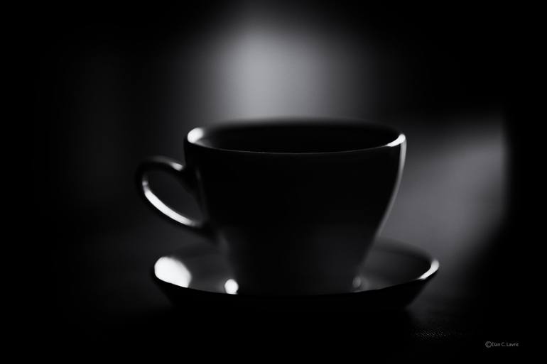 A cup is subtly illuminated in a dark setting, blending into the shadows around it. The focus is on the cup, while the background remains blurred and indistinct.