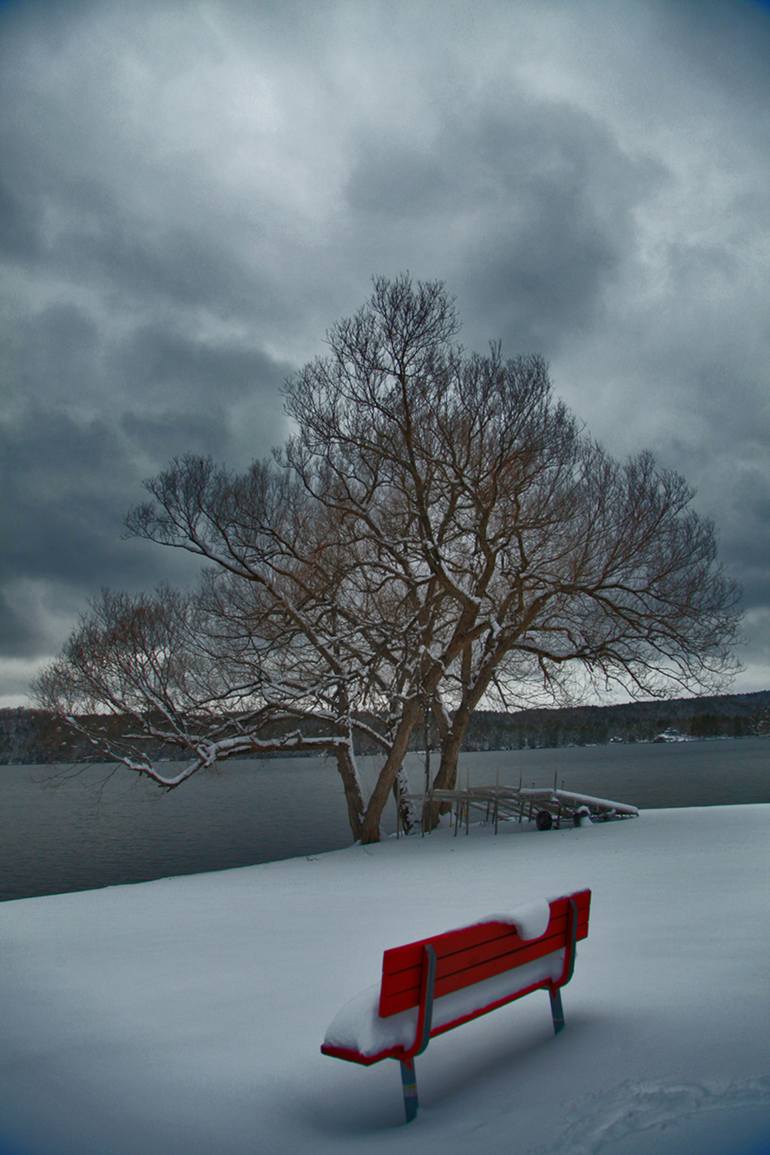 A bench laying Sideways with snow, Lake Baumosseen, Vt.