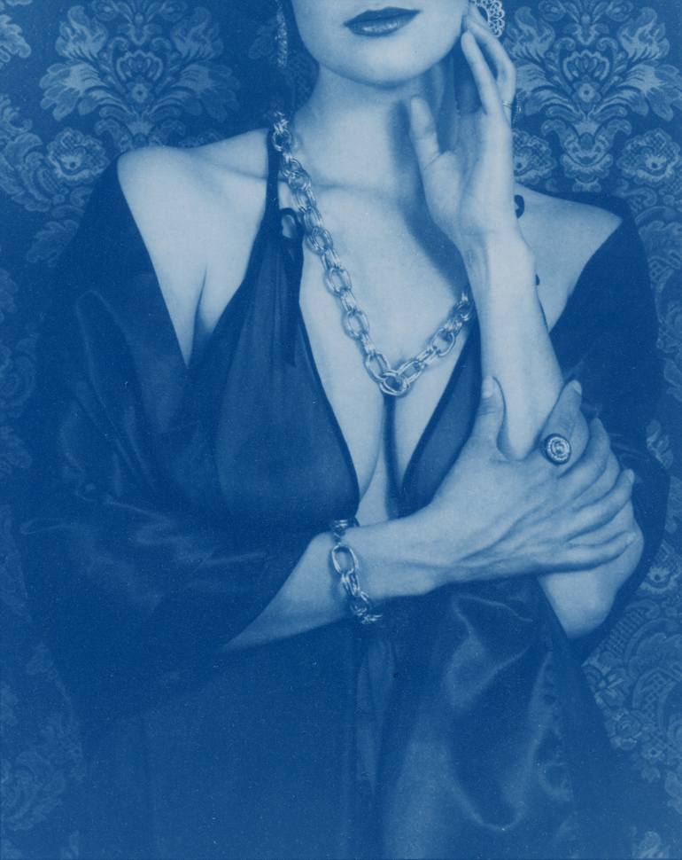 Cyanotype is one of the earliest photo processes discovered in 1842 by Sir John Herschel. Part of a series of images to express "sensuality", with details of silk, satin, lace, jewelry, flesh.