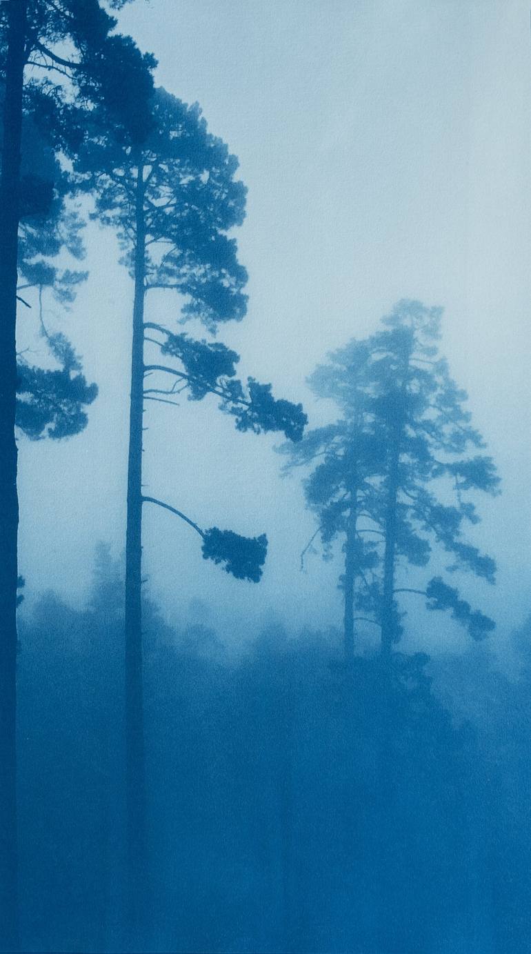 Clients include: Timothée Chalamet, Starbucks, Ritz Carlton, Mayo Clinic, Jumaira Resort (Dubai), Wyndham Worldmark Hotels, Kimpton Hotel Monaco, Evercore NY, Apollo Global Management, NY, Mazars Accounting NY, Limelight Mammoth Hotel & Residences, MD Anderson Hospital, Houston Methodist Hospital, Oakland International Airport. Christine So is a painter, photographer and printmaker living across the San Francisco Bay in the hills of Oakland, California. Her works are heavily inspired by the woods where she has lived and hiked for decades. She works in acrylic and in the antique photographic process of cyanotypes. She creates botanical and abstract prints without a camera lens, as well as hand-printed landscape photographs of the foggy woods where she lives. Whether it’s painting, printmaking, or photography, her work is always nature-inspired and nearly always monochromatic. She has worked in a dozen mediums, cycling back and forth from painting to printmaking to cyanotype, applying effects from one medium to the next. She bridges the mediums of photography, monoprinting and painting. Her favorite question when working in the antique photographic process of cyanotypes is “What would happen if…?” She has devised a range of atypical techniques using the cyanotype process. Arguably the most striking of her unique methods are her cyanotype paintings in her Delft Garden series. The painted silhouettes of plants each contain an intricate blue and white pattern within them when viewed up close.The lengthy process begins as a pencil drawing which is then painted in–not with ink or paint–but with the cyanotype light-sensitive mixture in a dark room. It’s a tricky process as it’s hard to see what one is painting in very dim light. Days later once the photography chemicals have dried in the painting, she lays plants on top of the painted silhouette in a pattern that will leave gaps similar to lace. She then carefully moves the entire bundle outside and exposes the pattern to sunlight to create the image-within-the-image. The blue and white pattern seen in each leaf resembles painted Delft pottery, thus the title of this series: Delft Garden. Another of the artist’s innovative techniques is her series of completely abstract cyanotypes printed without photo negatives or stencils.
