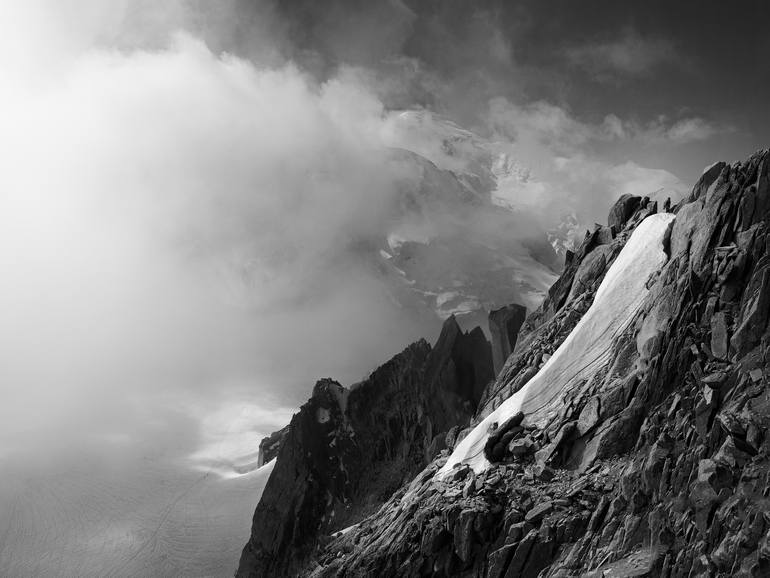 This image was shot as a panorama in September 2016 on the Aiguille du Midi summit in the French Alps. The natural elements there are huge and defy our perception of distances, even more troubled in this moment by a very fast changing light: the clouds at this moment are on their way to cover the Mo...