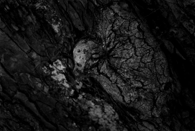 A skull seems to emerge from the trunk of the tree. It's all the stranger since this photo was taken in a cemetery. Photo in 135 format. Une tête de mort semble émerger du tronc de l'arbre. C'est d'autant plus étrange que cette photo a été prise dans un cimetière. Photo au format 135.