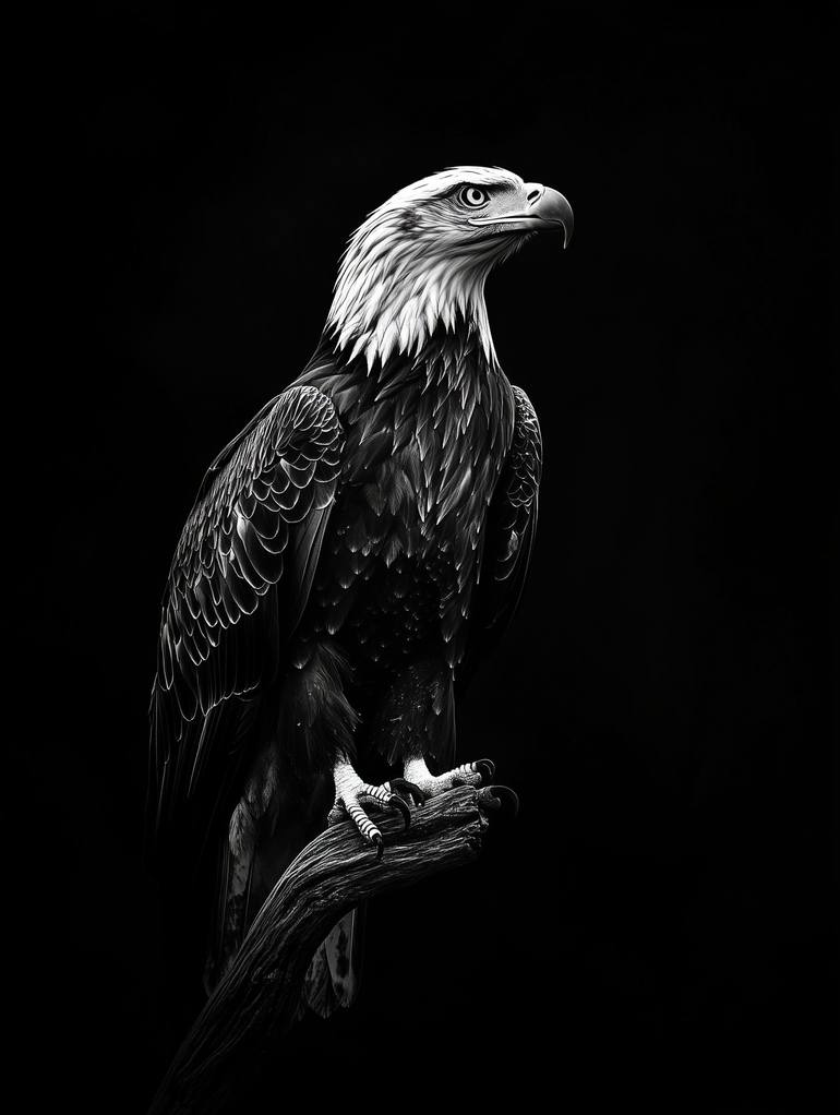 A powerful and majestic eagle stands proudly, captured in black and white against a dark background that highlights its strength and royal aura. This artwork exudes timeless elegance, perfect to enhance your interior with a touch of grandeur and mystery.