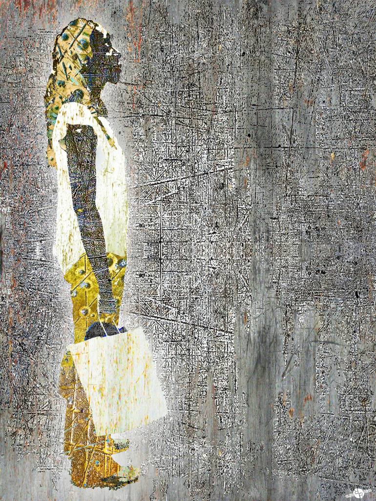 Woman on the street in New York City captured in sheet metal on metallic paper with acrylic on stretched canvas.