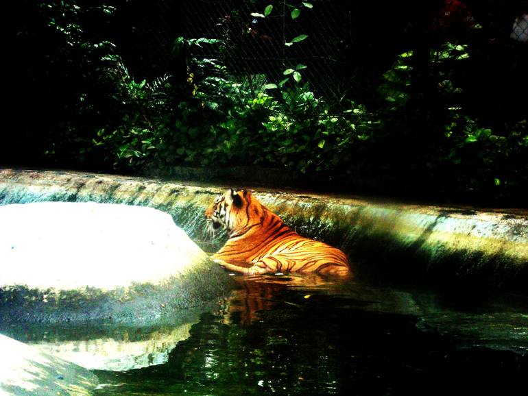 Tiger relaxing in a lake near by forest - Wild life Photograph