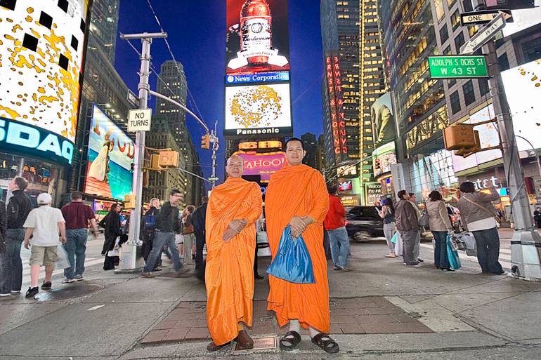 Two Buddhist monks pose for their portrait in Times Square, New York. A signed and numbered print from a limited edition of 10. Printed with a 2” (5 cm)white border to accommodate framing/mounting and the signature - the actual size of the printed image is 36” x 24” (91.5 x 61 cm). Beautifully gi...