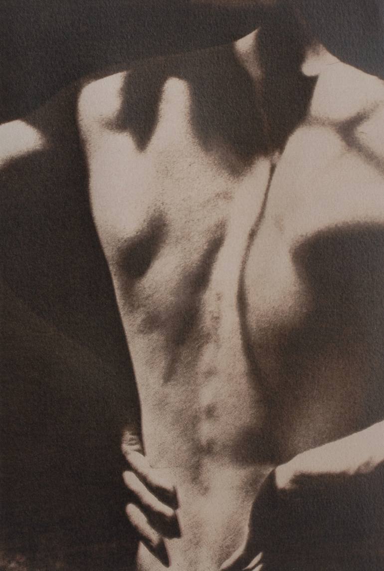 Light defines form. Color creates mood. Figuration is central. The headless back view, spine detail and shadows on this male torso create a sculptural quality to this live model. Due to the nature of the process, each gum bichromate print is unique. Originally photographed with a 35mm Nikon camera a...
