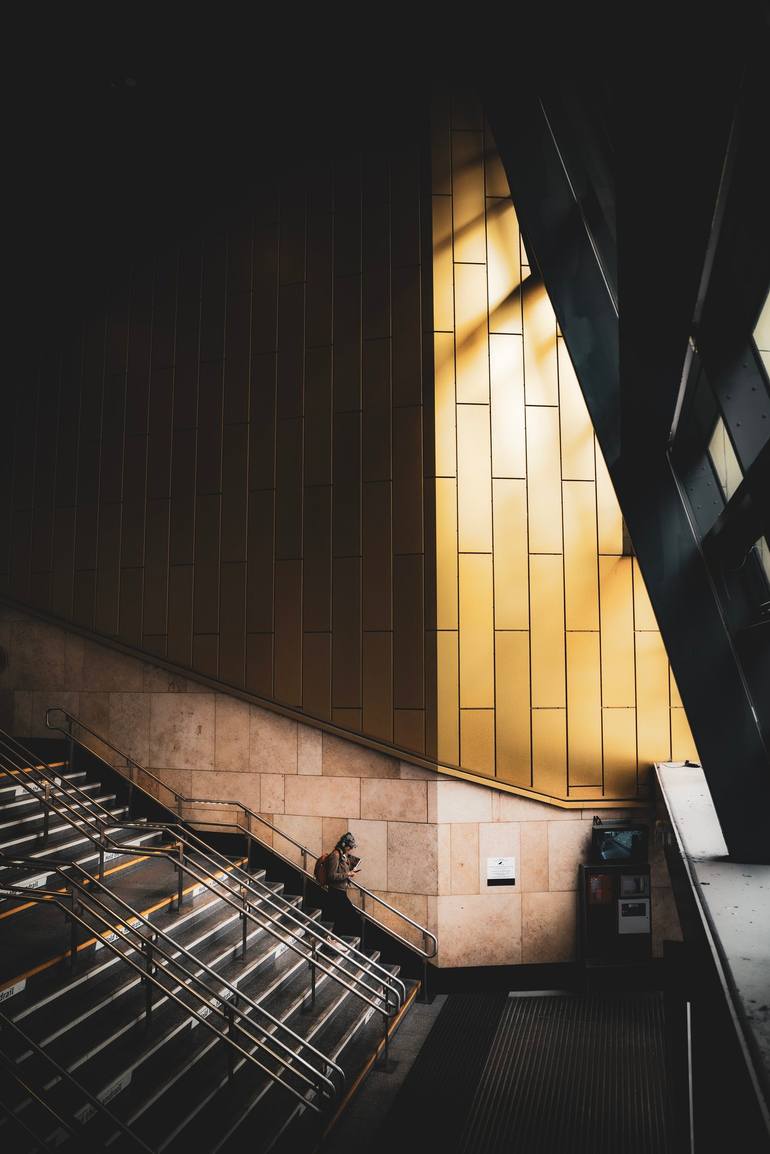 A traveller descends the stairs at Queen St. Station, Glasgow. Illuminated perfectly by the warm light flooding in from the large windows.