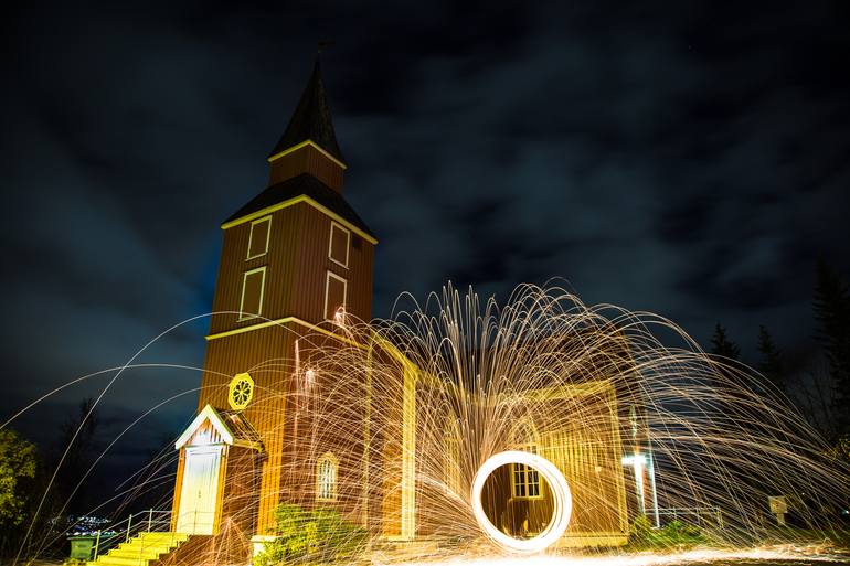 Capture the serene beauty of the Tromso Church with this captivating colour photograph. The artwork, a stunning example of photorealism, showcases the modern architecture of this iconic landmark in the heart of Scandinavia. The artist's lens beautifully captures the essence of a night scene, transfo...