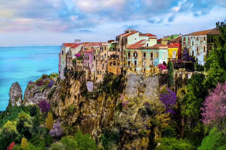 Medieval town, Tropea, Italy The original photograph was taken in 1988 with a 35mm black and white Fuji Film FP4, developed with my own formula. In that period I usually used to paint over the prints with oil colors, but the image offered here was painted digitally, so the actual colors, details and...