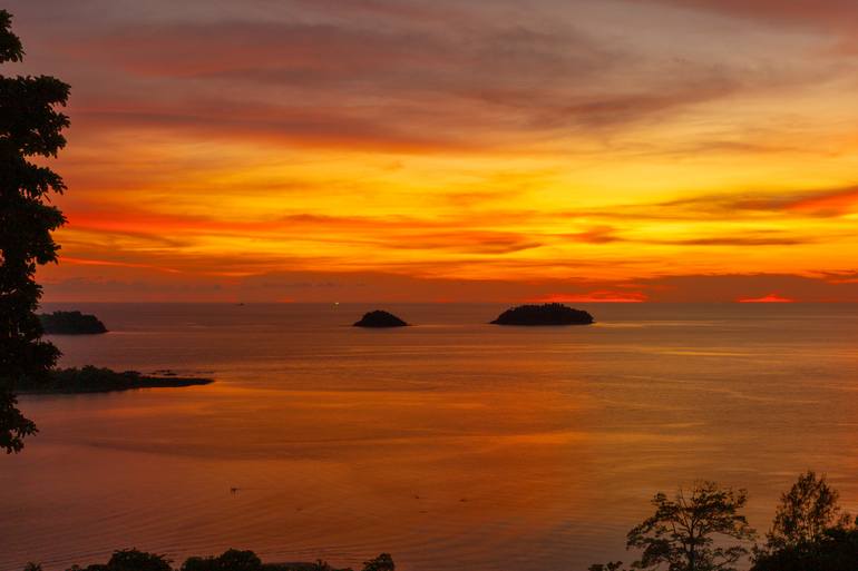 This work captures a quiet moment of sunset over the sea, where a small tropical island becomes a point of stillness within an expansive horizon. Rendered exclusively in warm shades of orange and yellow, the image distills the scene to light, color, and atmosphere. The fading sun transforms the lan...