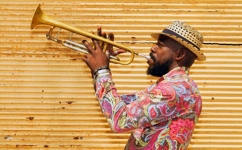 African trumpet player playing in the street against the background of yellow shutters in Havana, Cuba. This photo is taken during a session with authentic Cuban professional musicians and fully model released. The fine art giclée print is printed on a gallery quality Hahnemühle Fine Art, matt paper...