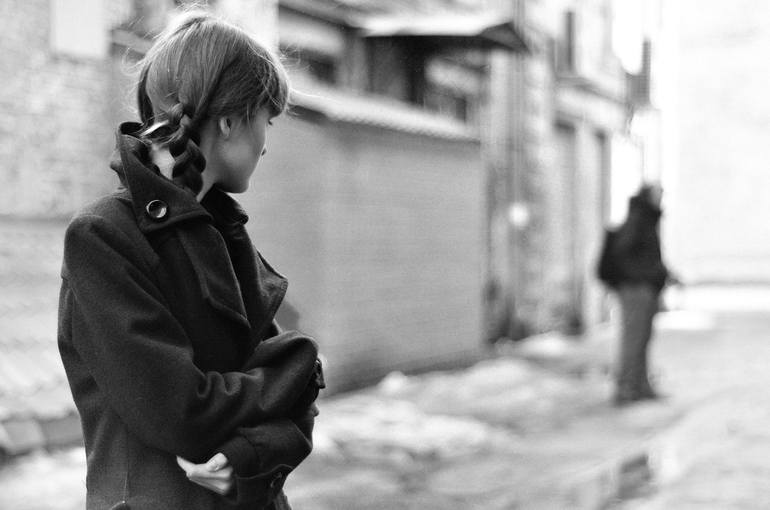 This is a black and white photo with a girl who looks back and a man who stopped. What is the relationship between them? Maybe they broke up and no longer want to be together, but still remember each other ... Or they love each other, but for some reason, they can’t be together ... Or are they simpl...