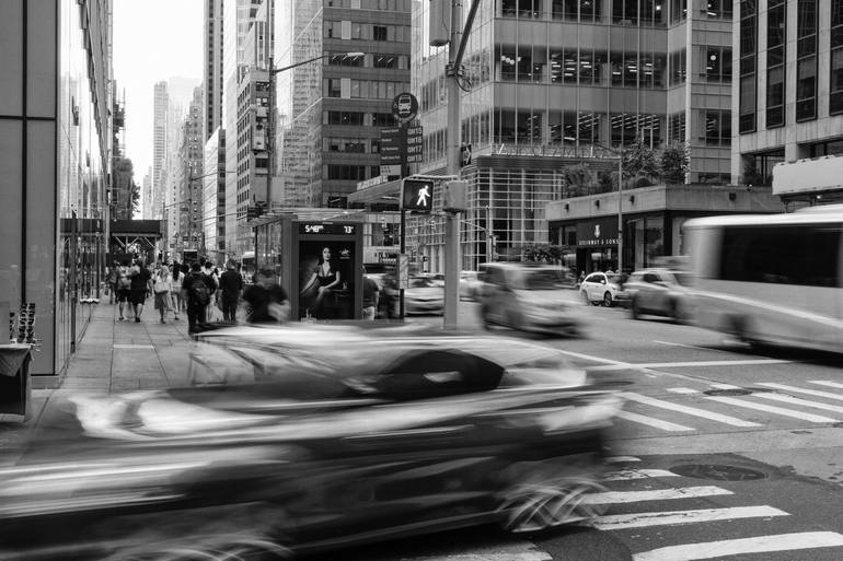 The corner of 44th St. and Avenue of the Americas (6th Ave.) provides a double expression: the crosswalk drama of a speeding auto swoops past the flagship showroom of famed piano house, Steinway and Sons. A grand symphony plays out in the black and white crosswalk markings that underline midtown's b...