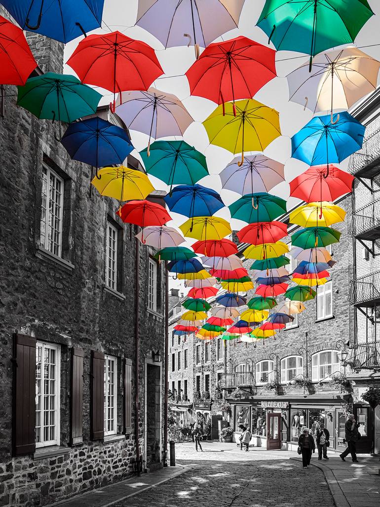 This is a photo taken in Quebec City in the style of hand tinted photography. A limited edition archival print of an umbrella lined street in Quebec City. The hand-tinted style of this photograph makes the umbrellas really pop out..