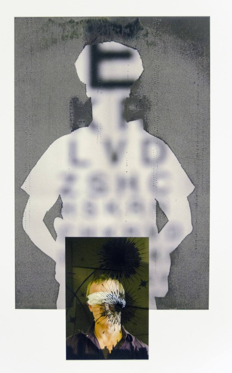 from ongoing work with one of a kind and one off photographs. Instagram shows a large overview of this project. Here two double printed photographs are mounted together, one a police silhouette and an out of focus eye chart; the smaller other image is a self-portraits and an inverted silhouette of f...